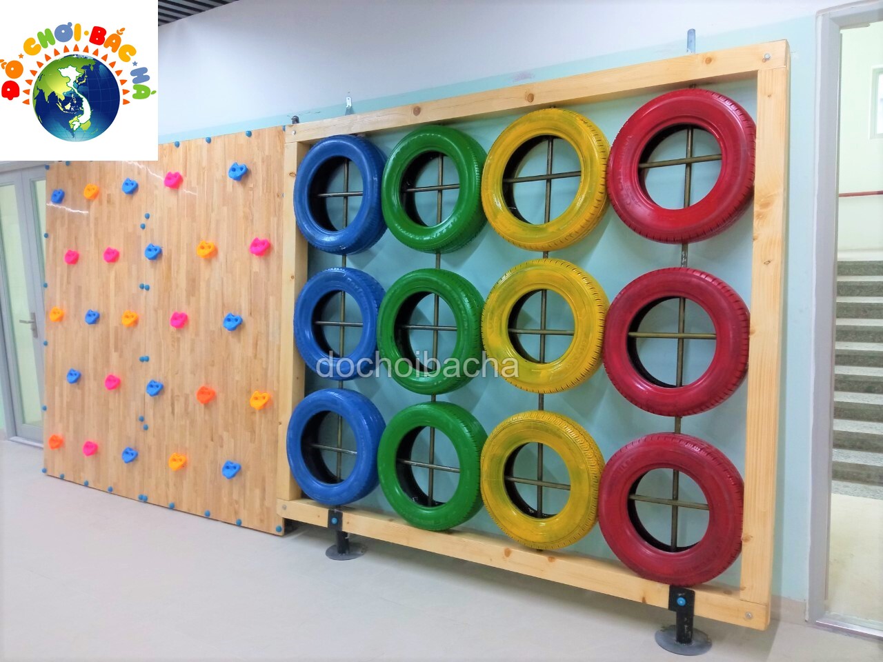 Vách leo núi lốp mang đến một trải nghiệm mới lạ với các lốp xe được sắp xếp thành các bức tường leo. Trò chơi này giúp tăng cường sức mạnh cơ bắp và sự linh hoạt cho trẻ em.