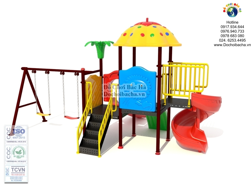 KT: 5400*3700*3000mm - Chất liệu: Thép + Nhựa - Bảo hành: 12 tháng - Đối tượng sử dụng : phù hợp với sân chơi cộng đồng cho trẻ em từ 2 - 12 tuổi . - Tình trạng hàng : Còn hàng - Màu sắc : Phối màu tùy thích. - Chú ý :  + Sản phẩm được sản xuất đồng bộ theo tiêu chẩn nhất định, cao nhất của...