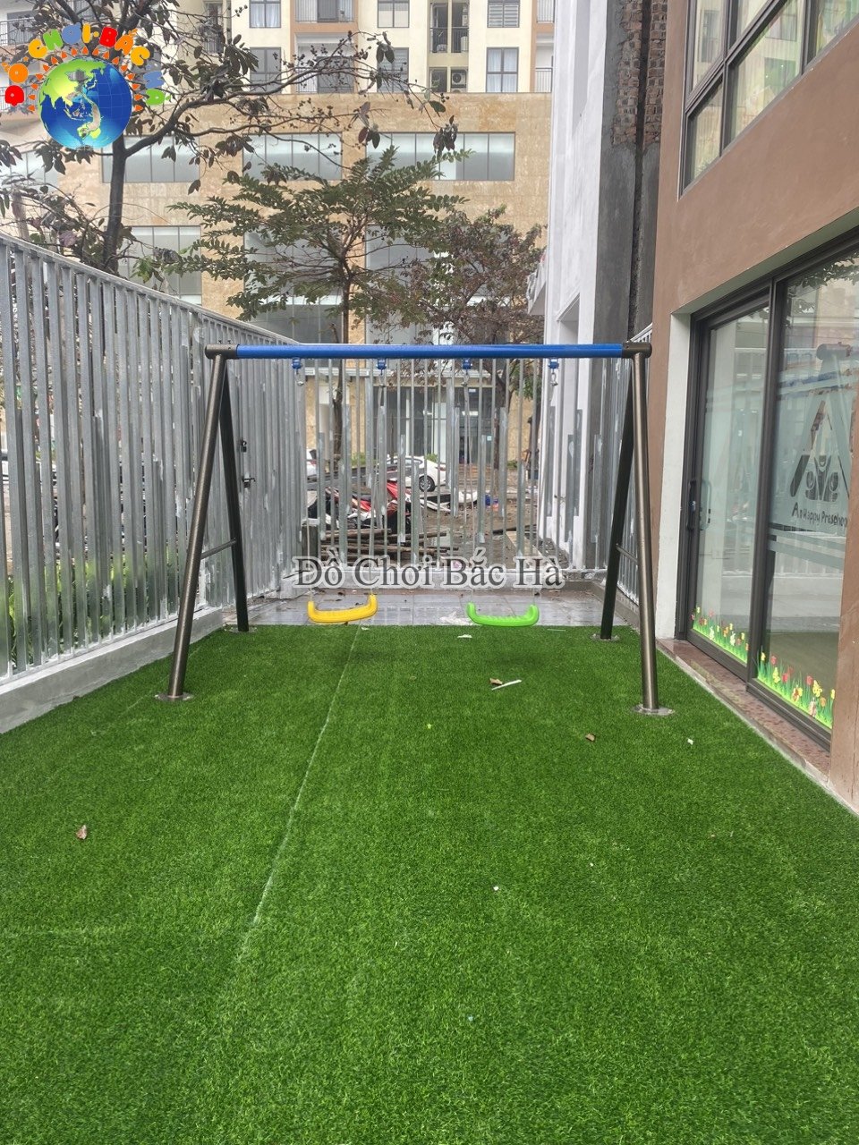 - Ngoài ra, sân chơi cần có lớp đệm mềm hoặc sàn chống trơn trượt để giảm thiểu chấn thương cho trẻ trong trường hợp ngã.